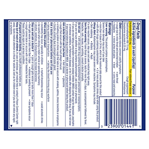 Temporarily relieves common cold and flu symptoms including cough due to minor throat and bronchial irritation, sore throat, headache, minor aches and pains, fever, runny nose and sneezing.