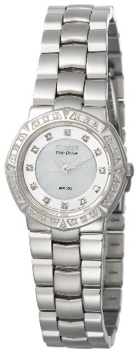 -. Feature : Light powered Eco-Drive Caliber E000 Japanese-quartz movement; charges in natural sunlight or indoor light / Max power reserve: 180 days; low charge warning: 7 days; Quick start ability; charge time from stop state to max charge: Incandescent Light - 72 hrs, Outdoors, Cloudy (10,000 Lux) - 22 hrs, Outdoors, Sunny (100,000 Lux) - 11 hrs / Durable, hardened mineral crystal; 40 total diamonds - 12 diamond hour markers and 28 diamonds in bezel; case diameter: 26 mm / Stainless-steel case; mother-of-pearl dial / Water resistant to 330 feet (100 M): suitable for snorkeling, as well as swimming, but not diving