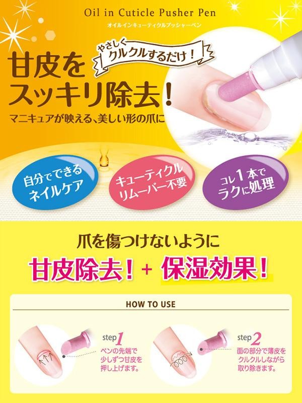 ※強く押しすぎて爪やお肌を傷つけないようご注意ください。 ※使用後はスポンジバッファーやシャイナーで磨くと美しい自爪がキープできます。 ※本製品をご使用後に続けてマニキュアを塗る場合は、オイルを拭き取ってください。 ※足の指にもお使いいただけます。 ※キャップ付きなので携帯にも便利です。 ※甘皮を必要以上に取り除くとささくれの原因になりますので、ケアは1週間から10日に1度を目安にしてください。