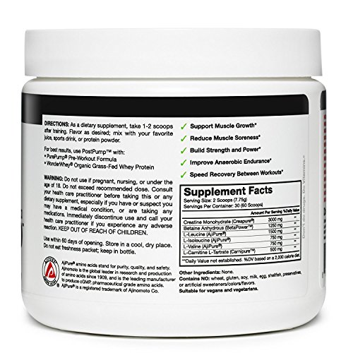 YOUR BODY DESERVES BETTER: Don't settle for second-rate, low-grade post workout ingredients. PostPump uses only the highest quality branded ingredients, including pharmaceutical-grade AjiPure amino acids, Creapure creatine monohydrate, and Carnipure L-Carnitine.