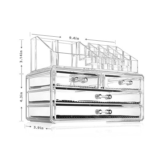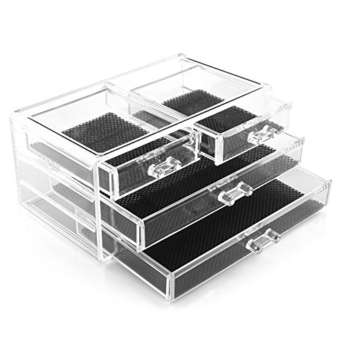 Made from durable high-grade moulded acrylic,much stronger and safer than glass, designed to withstand daily use and Clear construction makes it easy to find what you're looking for; Removable black mesh padding keeps your jewelry protected and in place and also keeps the drawers clean and cushion your makeup