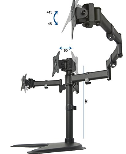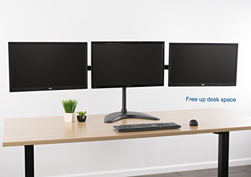 -. Binding : Electronics -. Brand : VIVO -. EAN : 0641020645743 -. Feature : COMPATIBILITY - Fits three computer monitors 13" to 24" with VESA 75x75mm or 100x100mm mounting holes (will fit 27" screens but will allow very limited angled screen positioning) / TRIPLE MONITOR FORCE - Clear up valuable work space and increase work efficiency with a three monitors mount alignment / FULLY ADJUSTABLE - Mounting arms and plates offer 90° tilt, 90° swivel, and 360° rotation. Monitors can be placed in portrait or landscape shape / SOLID STEEL CONSTRUCTION - This stand was built to last with high grade steel and aluminum construction, and a rigid tested support system, easily supporting three screens weighing up to 17.6 lbs each / PERFECT MONITOR ALIGNMENT - The VESA plates allows each individual plate to be adjusted up and down by 1.1" so your monitors will be perfectly aligned -. Label : VIVO -. Manufacturer : VIVO -. Model : STAND-V003P -. MPN : STAND-V003P -. PartNumber : STAND-V003P -. ProductGroup : PC Accessory -. ProductTypeName : COMPUTER_COMPONENT -. Publisher : VIVO -. Studio : VIVO -. Title : VIVO Triple Monitor Mount Fully Adjustable Desk Free Stand for 3 LCD Screens upto 24" (STAND-V003P) -. UPC : 641020645743