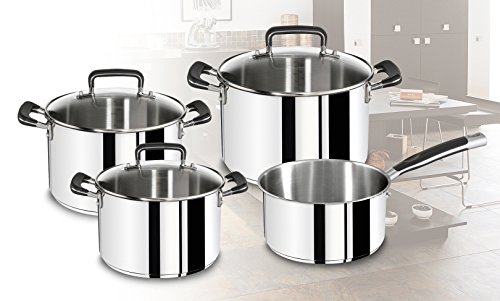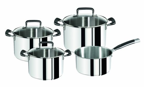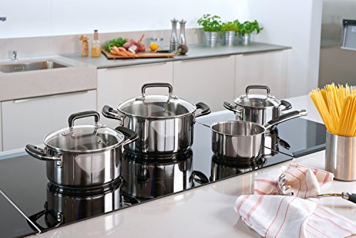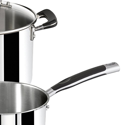 -. Feature : Edelstahl in Profi-Qualität / Starker Kapselboden für perfekte Hitzeverteilung / Genietete, ergonomische Edelstahl-/ Silikon-Griffe. / Glasdeckel mit Edelstahlrand / Geeignet für alle Herdarten, auch Induktion