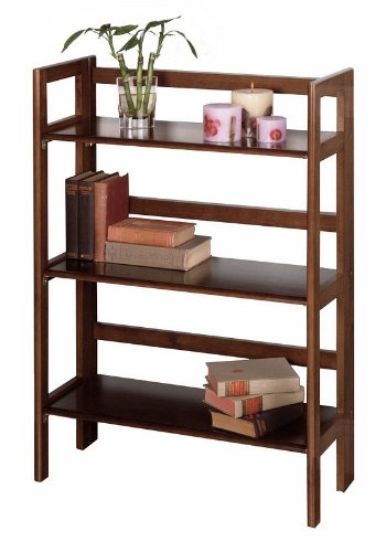 -. Title : Basics 39" H Antique Walnut Folding Three Tier Bookshelf # 94896