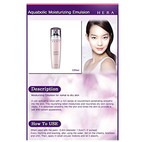 -. Binding : Misc. -. Brand : HERA -. EAN : 0642968575598 -. Feature : HERA Aquabolic Moisturizing lsion (2015 New) / 4.06 Oz/120Ml For Dry / Normal Skin (Day n Night) / Contains B-glucan that has a proven n powerful skin-moisturizing effect to lay the foundation for skin protection. It is effective even in dry conditions. / Restores cutaneous circulation for the instant delivery of rich moisture n nourishment to the skin. / A softly-textured skin lsion that melts into the skin to keep the skin smooth and radiant. -. Label : Amore Pacific -. Manufacturer : Amore Pacific -. MPN : JHICHERAQMDN12 -. PartNumber : JHICHERAQMDN12 -. ProductGroup : Beauty -. ProductTypeName : BEAUTY -. Publisher : Amore Pacific -. Studio : Amore Pacific -. Title : HERA Aquabolic Moisturizing lsion 4.06 Oz/120Ml For Dry Skin (2015 New) -. UPC : 642968575598