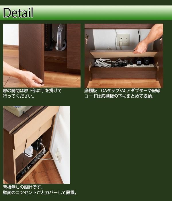 モデム・ルーター・ACアダプター・OAタップや配線コードなどを隠して収納できます。背面無しの設計なので、壁面のコンセントごとカバーして設置可能です。 |