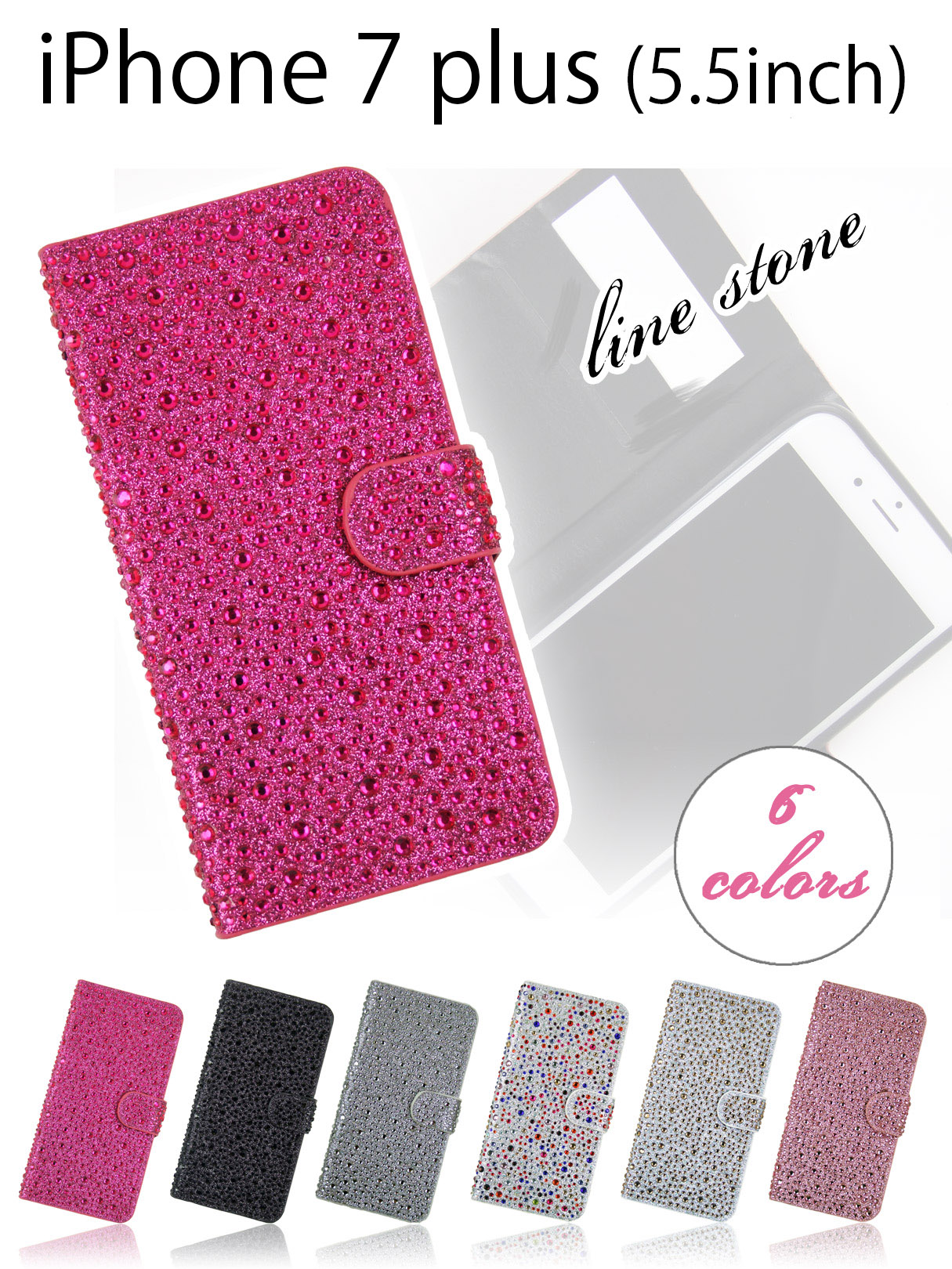 ◆手帳型iPhoneケース◆ストーンデコレーションが美しいラインストーンを全面にデコレーションしたゴージャスな手帳型ケースの登場です。二つ折りなのでスマートなシルエット、携帯にかさばりません。ラメシートの表面全体にデコレーションされたラインストーンは特殊製法により、剥がれにくく、クリアに輝きます。内側には2カードケース付き、さらにマグネット式のストッパーなど、実用面もバッチリ!ラメとストーンで目立つこと間違いなし!!あなたの個性を引き立てる魅力的な手帳ケースです。※ご利用のモニター、ディスプレイにより若干色味に差がある場合がございます。ご了承ください。※商品の生産時における装飾等は海外にて手作業で行っており、多少の差異がある場合がございます。ご了承ください。
