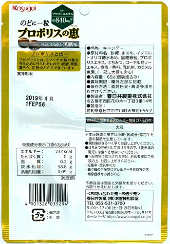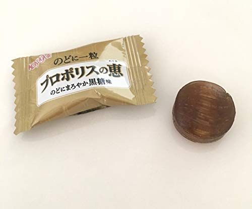 原材料:砂糖、水あめ、イソマルトオリゴ糖水あめ、黒糖顆粒(黒糖100%(沖縄産))、プロポリスエキス、はちみつ、ローヤルゼリーエキス、食塩/香料、乳化剤、カラメル色素、(一部に大豆を含む)