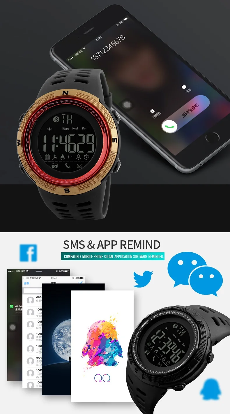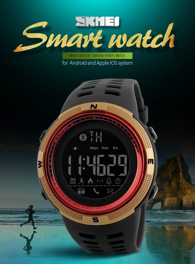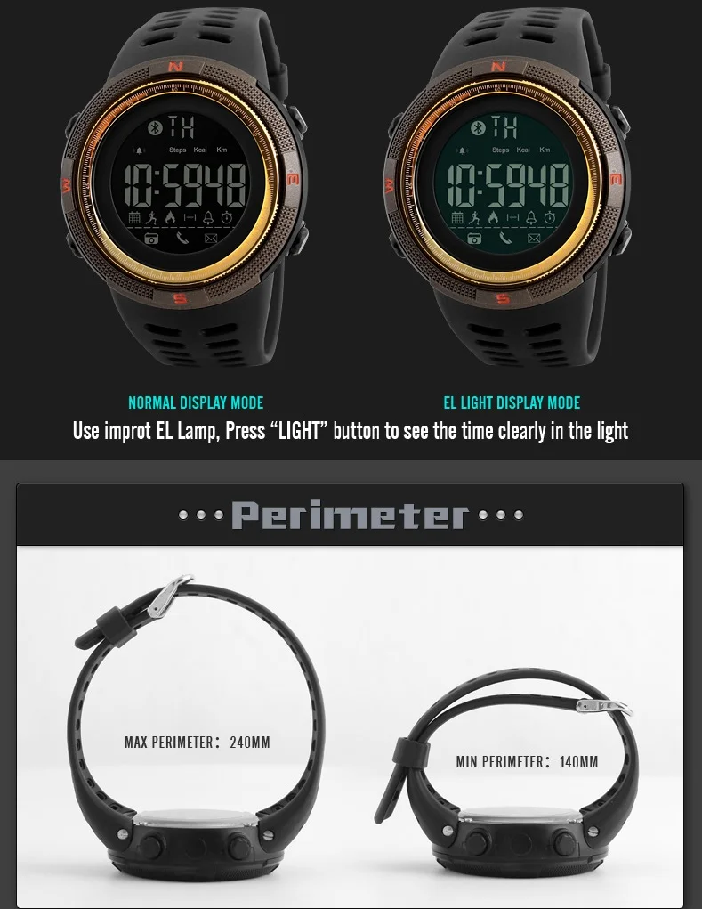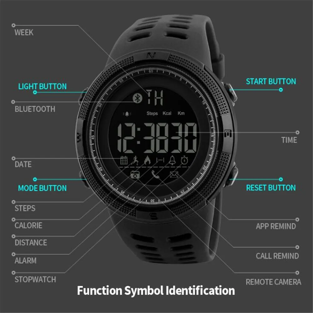 Feature:Back Light,Alarm,Water Resistant,Chronograph,Message Reminder,Call Reminder,Bluetooth,Stop Watch,Complete Calendar,Auto Date,LED display