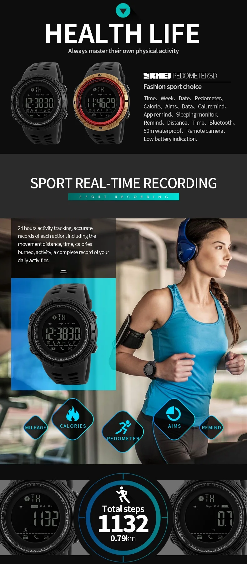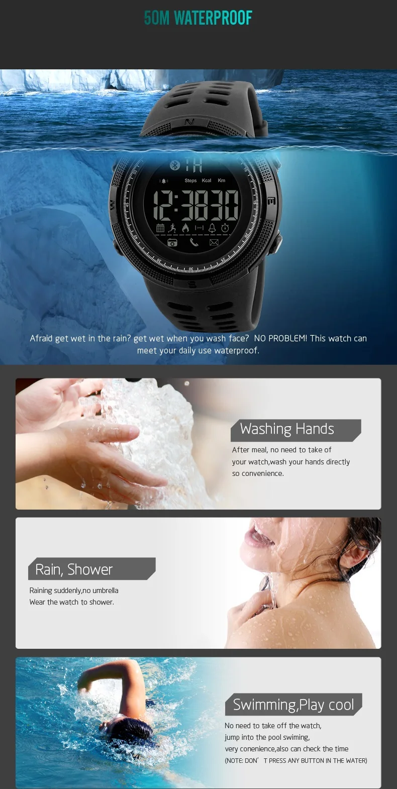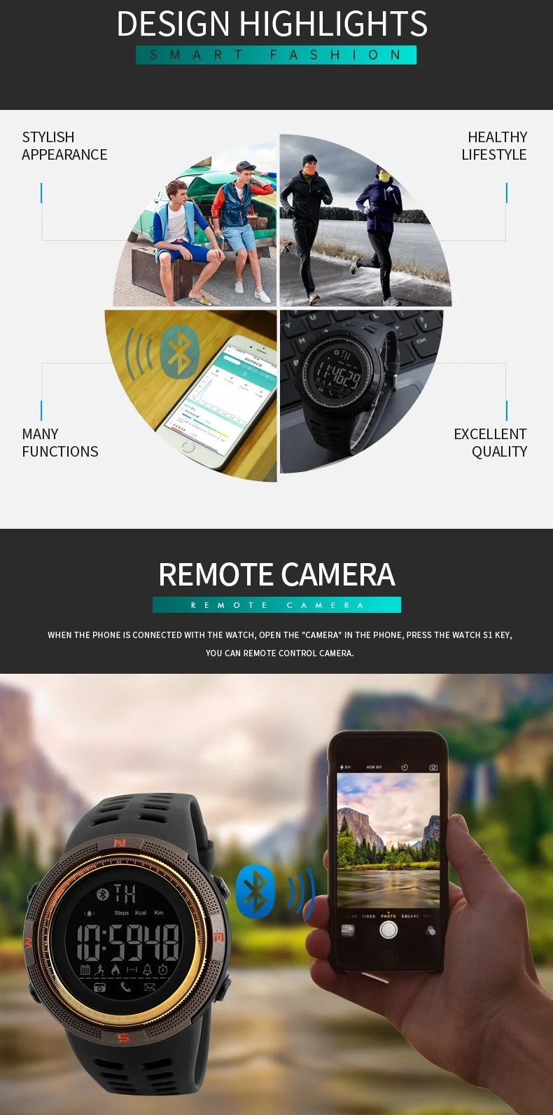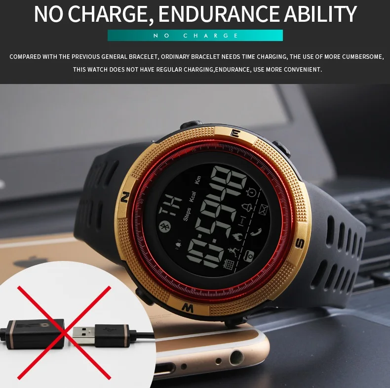 Feature:Back Light,Alarm,Water Resistant,Chronograph,Message Reminder,Call Reminder,Bluetooth,Stop Watch,Complete Calendar,Auto Date,LED display