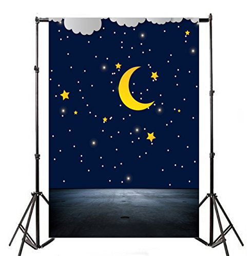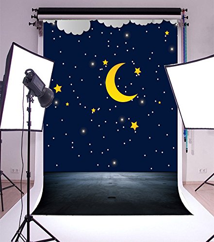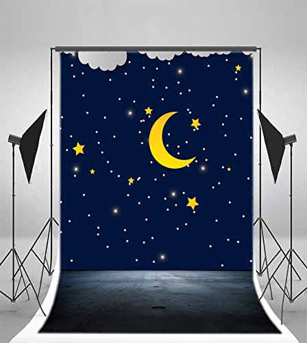 Laeacco Vinyl 5x7FT Photography Background Quite Mysterious Night Sky Stars and Moon Cartoon Clouds Edge Pattern Dark Blue Tone Background Gray Cement Floor Scene Children Baby Kids Portrait