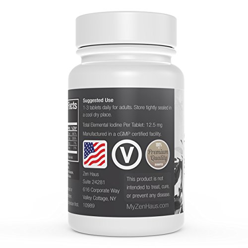 12.5 mg of elemental iodine per tablet contains both molecular iodine (I2) and potassium iodide (KI). Iodine is an essential nutrient that is vital for proper thyroid, brain, adrenal, breast, ovary and prostate function.