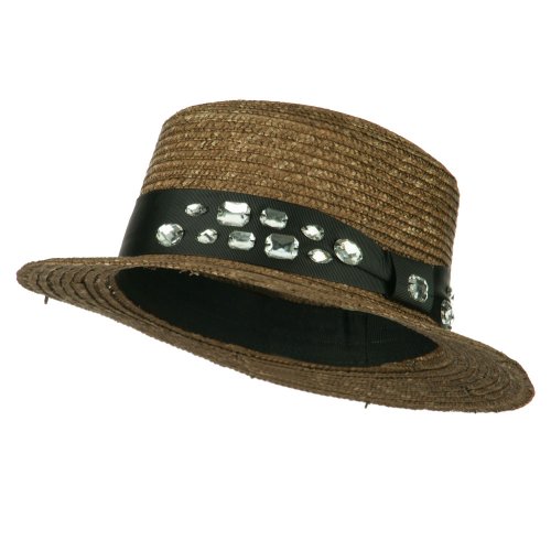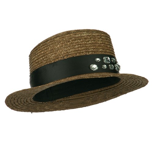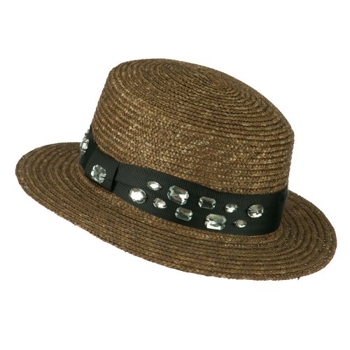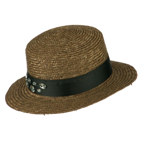 Binding : Apparel Product Description Natural wheat braided boater hat with grosgrain ribbon band. Circular round crown. Black hat band accentuates the crown with rhinestone detail. Flat brim is naturally downturned. Our women's boater cloche hat is great for both special occasions and casual outings. Spring and Summer. Soft, thin and cool material. 11 1/4 (W) X 12 (L) X 4 1/2 (H) inches. Available in different colors and styles. 0