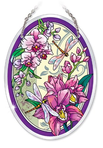 Amia 41015 Hand Painted Beveled Glass 5-1/2 by 7-Inch Oval Sun Catcher, Orchid Collage with Dragonfly, Medium