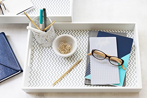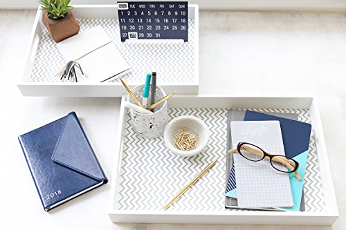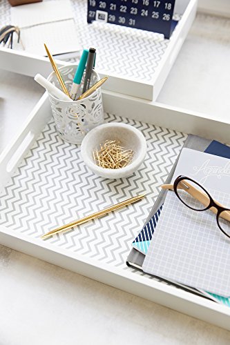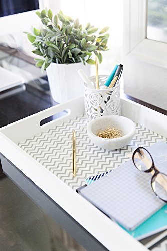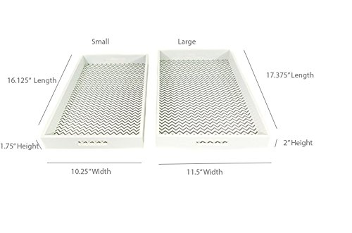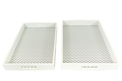 Serve Food in Style with a Set of Two Chevron Pattern Serving Trays. Serving food to friends and family has never been so fun or so chic! This set of two white chevron pattern serving trays with handles are the perfect accessory to your home or kitchen. Bring out the breakfast! Whether you love breakfast in bed or just keeping everything organized, this set of two trays is just the thing for your home. With white finish and white and grey chevron pattern, this chic tray set will look great and function well, too! Product Details: - Set of Two Trays