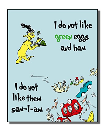 Adorable set of 4 Dr. Seuss themed prints from four popular books: Cat in the Hat, One Fish Two Fish Red Fish Blue Fish, Oh the Places You'll Go and Green Eggs and Ham.