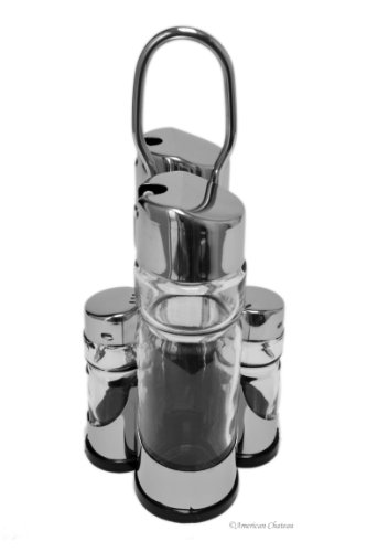 -. Brand : American Chateau -. EAN : 0622892025574 -. Feature : Oil, Vinegar, Salt and Pepper and stand / Glass and Stainless Steel Construction with Plastic Pourers / Screw Top for Easy Refilling / Approximate Dimensions: 9" x 4" x 4", Capacity: 7 oz -. Label : American Chateau -. Manufacturer : American Chateau -. MPN : NV4ND031 -. PartNumber : NV4ND031 -. ProductGroup : Kitchen -. ProductTypeName : KITCHEN -. Publisher : American Chateau -. Studio : American Chateau -. Title : Stainless Steel & Glass Oil and Vinegar Salt Pepper Shakers Cruet Set with Caddy -. UPC : 622892025574