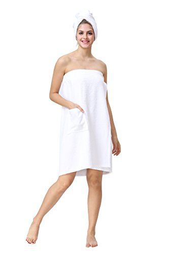 Acanva Women's Terry Shower Spa Towel Bath Wrap With Adjustable Hair Turban - White