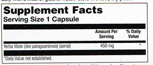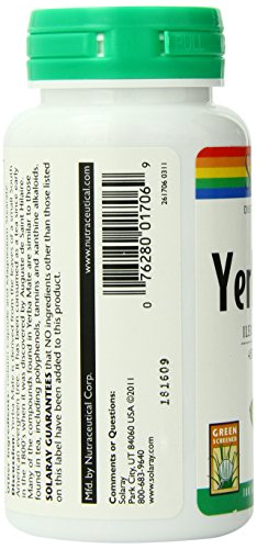 -. Binding : Health and Beauty -. Brand : Solaray -. EAN : 0076280017069 -. Feature : Contains antioxidants like polyphenols, tannins and zanthine alkaloids that help fight fatigue / Increase energy while giving your immune system a healthy boost / Contributes to healthy weight loss as part of a diet and exercise program -. IsAdultProduct : 0 -. Label : Solaray -. LegalDisclaimer : These statements have not been evaluated by the Food & Drug Administration. This products is not intended to diagnose, cure, mitigate, treat, or prevent any disease. -. Manufacturer : Solaray -. MPN : S1706 -. NumberOfItems : 1 -. PackageQuantity : 1 -. PartNumber : S1706 -. ProductGroup : Health and Beauty -. ProductTypeName : HEALTH_PERSONAL_CARE -. PublicationDate : 2014-10-04 -. Publisher : Solaray -. ReleaseDate : 2015-03-19 -. Size : 100 -. Studio : Solaray -. Title : Solaray Yerba Mate Supplement, 450mg, 100 Count -. UPC : 076280017069