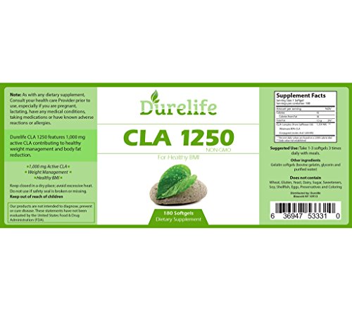 -. Feature : High Potency CLA 1,250 mg 180 softgel Count Is Backed By A 90 DAY SATISFACTION OR MONEY BACK GUARANTEE, Purchase With Confidence Knowing That We Only Source The Absolute Best Quality CLA Available On The Market / DureLife CLA Supplement May Help Maintain Healthy Bmi And Decreases Number And Size Of Adipocytes (fat Cells), Lowering Your Body Fat Mass. And Increases The Rate At Which Fat Cells Disintegrate, Reducing The Number Of Existing Fat Cells In Your Body. / DureLife CLA 1,250 Supplement Has Multiple Health Benefits Such As Healthy Immune System, Anti-inflammatory And Healthy Hair, Skin And Nails. / DureLife CLA 1,250 Mg SoftGel Is Made From BOVINE GELATIN Which Is the Best Source of SoftGel Gelatin according To the Latest Studies. / DureLife CLA 1,250 180 softgel Count Are Preservatives, Gluten, and GMO free. Manufactured And Packaged In The USA In a GMP Approved Facility for purity and potency