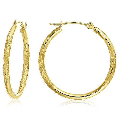 -. Binding : Jewelry -. Brand : Tilo Jewelry -. Department : womens -. Feature : Crafted in 14k yellow gold / Diamond-cut Pattern with Sating Finish and Star design / Diameter - 1 inch / Ships in an elegant gift box / Made in USA -. Model : HDC25M1 -. ProductGroup : Jewelry -. ProductTypeName : FASHIONEARRING -. Title : 14k Yellow Gold Diamond-cut Round Hoop Earrings with Satin Finish-1'' Diameter