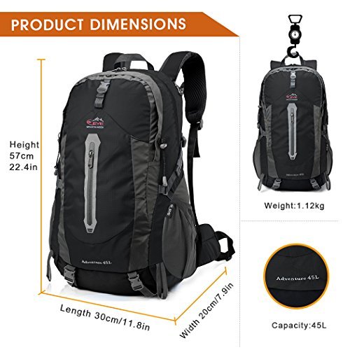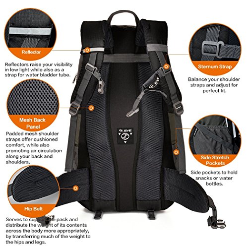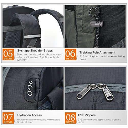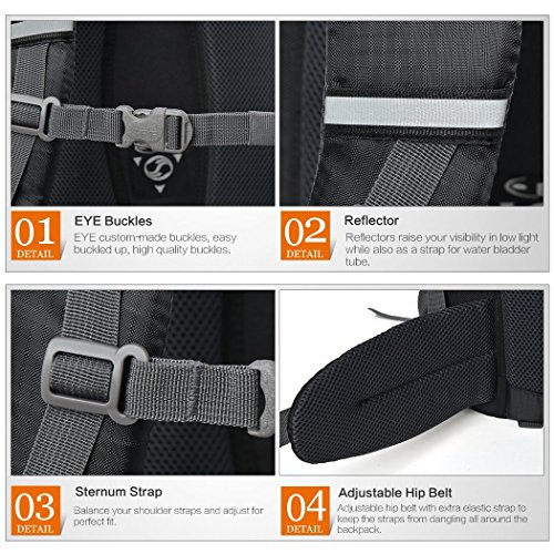 Bearing System: 3.Padded and breathable mesh back panel and shoulder straps offer cushioned comfort. 4.S-shape shoulder straps fit your body perfectly. 5.Adjustable sternum strap. 6.Waist strap distribute and transferring much of the weight to hips and legs. 7.Shoulder strap reflective stripe improve nighttime visibility,also as a strap for water bladder tube. Attachment Point: 8.Soft latching loop and bottom loops can hang trekking pole or tripod. 9.waterproof rain cover on the bottom pocket,deploys easily.