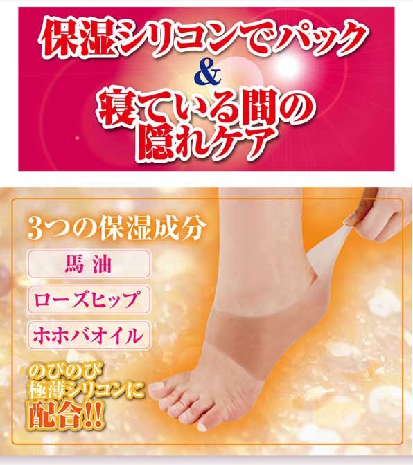 寝ている間も外出中も24時間ケアできるシリコンパック式!かかと集中ケアだから足がムレず、かかとだけツルツルスベスベに!のびのび伸縮するシリコン素材なので足にしっかり密着。かかとから出る水分を逃がさず閉じ込めることで保湿してくれるんです。さらに、乾燥対策に馬油、ローズヒップ、ホホバオイルがシリコンに配合!