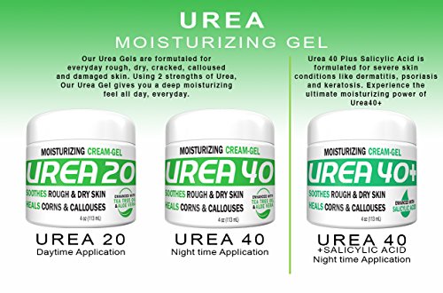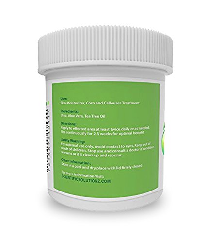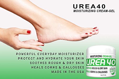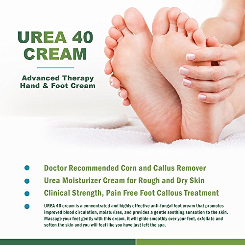 The formation of calluses is caused by an accumulation of dead skin cells that harden and thicken because of excessive pressure over a specific area of the foot. This callus formation is actually the body's defense mechanism to protect the foot against excessive pressure and friction. Calluses are normally found on the ball-of-the-foot, the heel, and/or the inside of the big toe. It is reported that about 5% (16 million) of the U.S. population has a problem associated with corns or calluses UREA 40 cream (ointment) is specially formulated to remove thick, callused areas while re-hydrating skin to a healthy appearance, a softer, smoother and more ravishing skin surface. It is a concentrated and highly effective anti-fungal foot cream ointment that promotes improved blood circulation, moisturizes, and provides a gentle soothing sensation to the skin. Massage your feet gently with this cream, it will glide smoothly over your feet, exfoliate and soften the skin and you will feel like you have just left the spa. When applied thinly it will act as a quick absorbing foot lotion while applied more generously it will act as a long lasting emollient foot balm. PRODUCT FEATURES? 4 oz jar contains blend of Urea 40%, Aloe Vera and Tea Tree Oil ? Manufactured at FDA, APHA, PCCA affiliated specialty pharmacy in USA ? Clinically proven to heal dry rough feet by protecting moisture loss ? White, thick, fast absorbing and a fragrance free cream