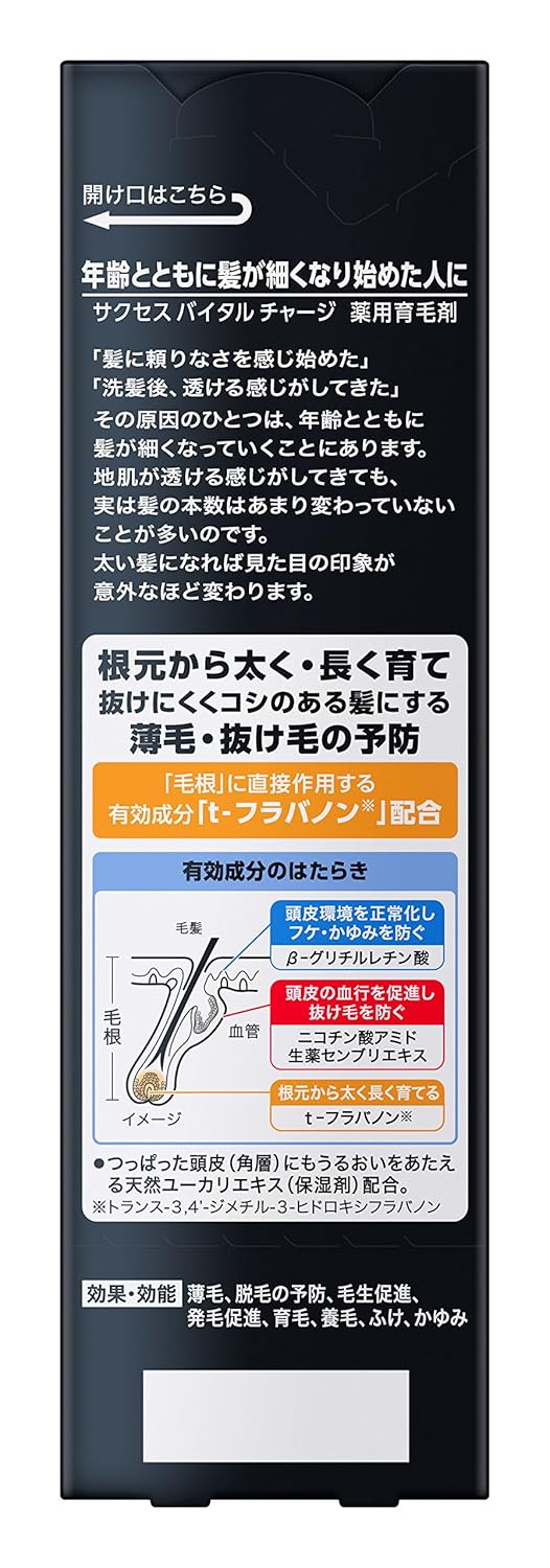 髪が細くなり始めた人に。有効成分【t-フラバノン*】配合、髪一本一本を根元から太く長く育て、薄毛・抜け毛を防ぐ。有効成分【ニコチン酸アミド】と【生薬センブリエキス(スエルチアマリンKI)】が、頭皮の血行を促進し、抜け毛を防ぐ。有効成分【β-グリチルレチン酸】が頭皮環境を正常化し、フケ・かゆみを防ぐ。液ダレ防止成分配合で、タレにくくマッサージしやすい。頭皮の気になる部分に薬効成分が直接行き届くダイレクトタッチ式。無香料。*トランス-3,4'-ジメチル-3-ヒドロキシフラバノン