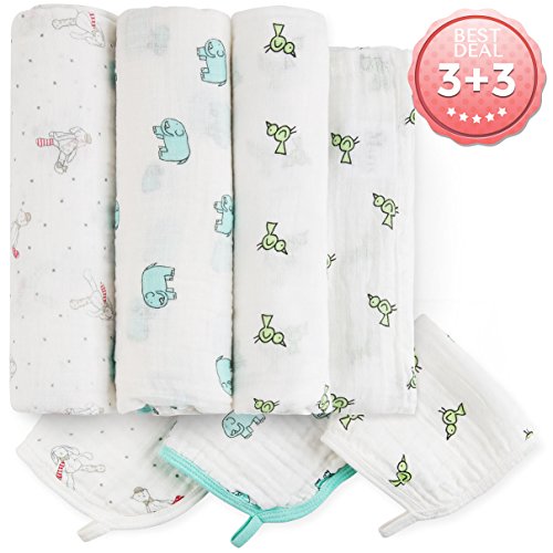 -. Title : Baby Muslin Swaddle Blanket - 3+3 Organic Cotton Receiving Blankets & Washcloths Set - Large Unisex Swaddles Perfect For Swaddling - New Born Baby Shower Gift Box
