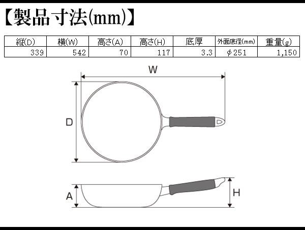 ガス火に最適なフライパン。内面は「テフロン(TM)プラチナプラス加工」で料理を美しく仕上げ、汚れもサッと落ちます♪本体は熱伝導の良いアルミニウム合金製。底は3.3mmの厚さで熱変形に強く、熱ムラのない熱伝導が可能です。 |