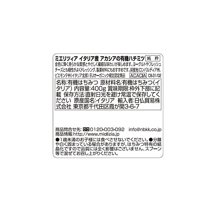 원본상품명: Mielizia(ミエリツィア) 有機ハチミツ 400g