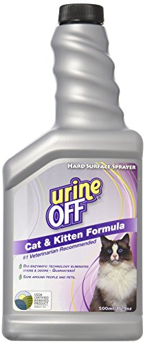 -. Binding : Misc. -. Brand : Urine Off -. EAN : 0857064001067 -. Feature : Bio-Enzymatic technology eliminates stains and odors Guaranteed / Safe around people and pets / 100-Percent guaranteed / Helps speed up house training / Designed for hard surfaces -. Label : Urine Off by Bio-ProResearch LLC -. LegalDisclaimer : Same formula and UPC code for this product but comes in the previous style Brown bottle. -. Manufacturer : Urine Off by Bio-ProResearch LLC -. Model : 16.9oz Cat Sprayer -. MPN : 16.9oz Cat Sprayer -. NumberOfItems : 1 -. PackageQuantity : 1 -. PartNumber : 16.9oz Cat Sprayer -. ProductGroup : Pet Products -. ProductTypeName : PET_SUPPLIES -. Publisher : Urine Off by Bio-ProResearch LLC -. Studio : Urine Off by Bio-ProResearch LLC -. Title : Urine Off Sprayer for Cats, 16.9-Ounce -. UPC : 857064001067