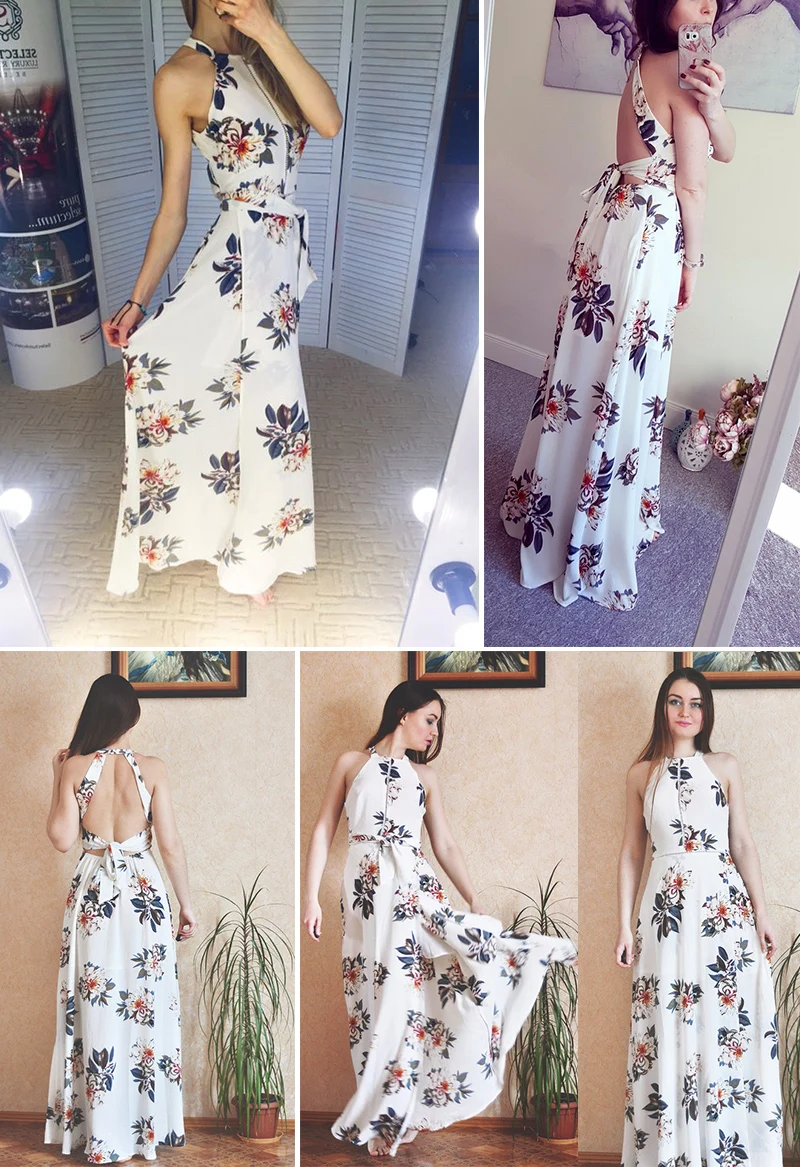 simplee花プリントホルターシフォンロングドレス女性ホワイト分割ビーチ夏のドレスセクシーな背中の開いたマキシドレスvestidos 2017新しい