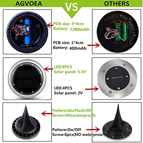 - ✔12 MONTHS GUARANTEE : AGVOEA solar powered ground light have 1 year warranty and 30 days worry-free return service.If you have any questions and suggestions,please contact our customer support.
