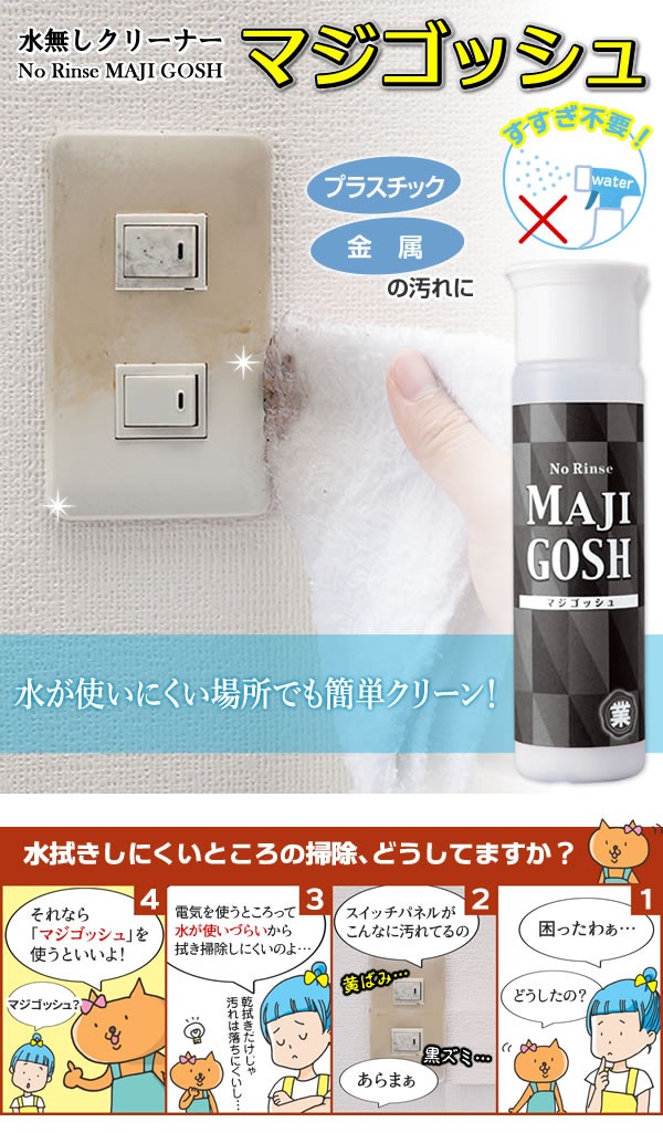 スイッチや家電品の水洗いしにくい場所の気になる汚れを簡単に落とせるクリーナー。気になる場所に塗り込んで磨くだけのすすぎや水を使わないクリーナー。