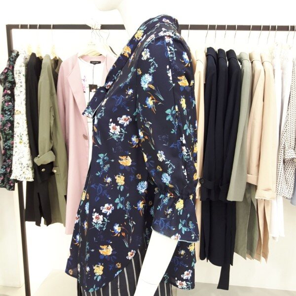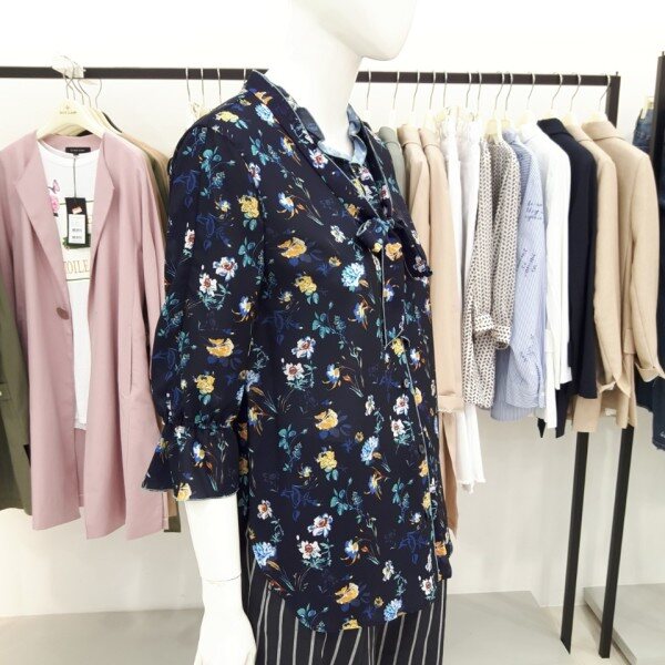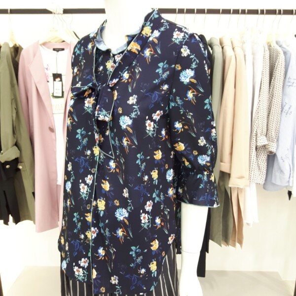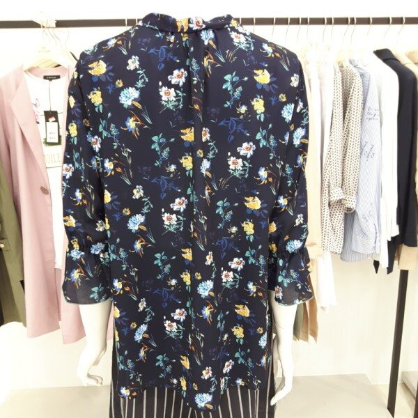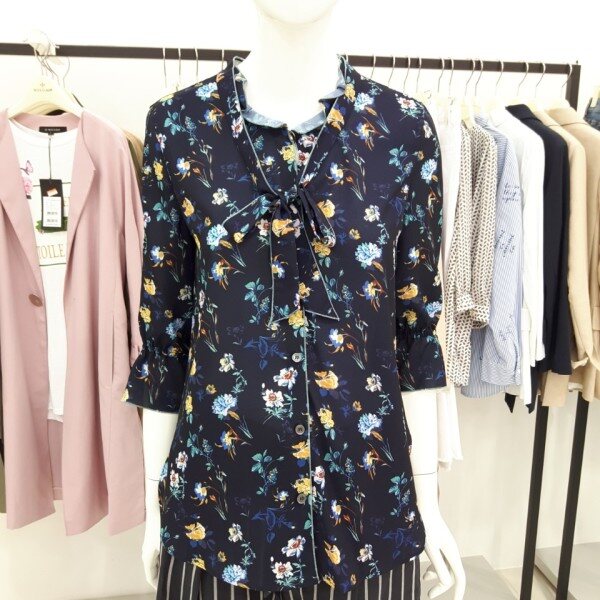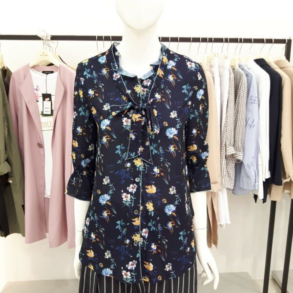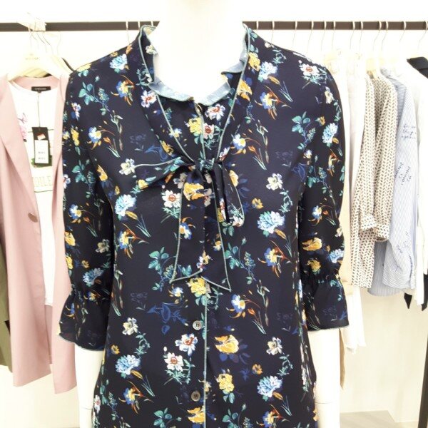 나이스크랍 화사한 꽃 프린트에 리본으로 포인트를준 칠부 블라우스입니다