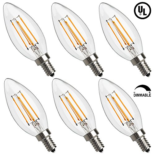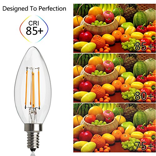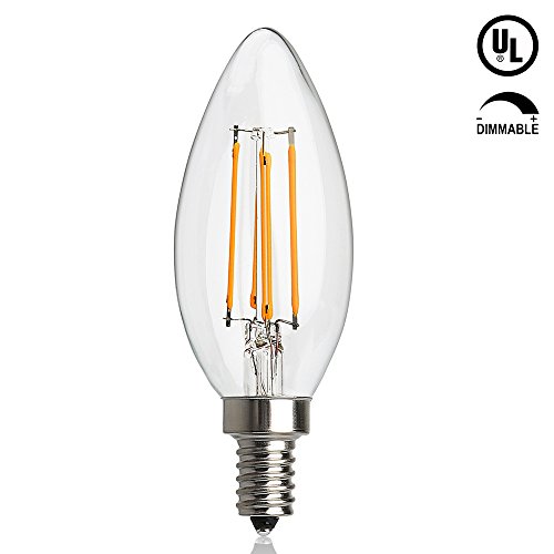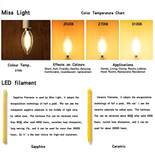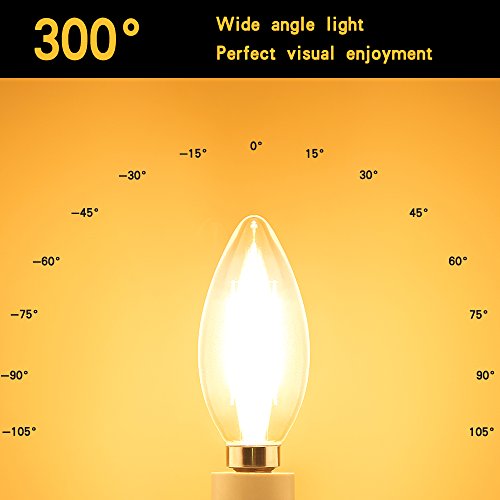 TECHNICAL FEATURES -Dimmable from 50% to 100%, input voltage AC 110-130V, overload and short circuit protection, Power 4W, Warm White 2700K, CRI >85, 400 Lumens, E12 Candelabra Base