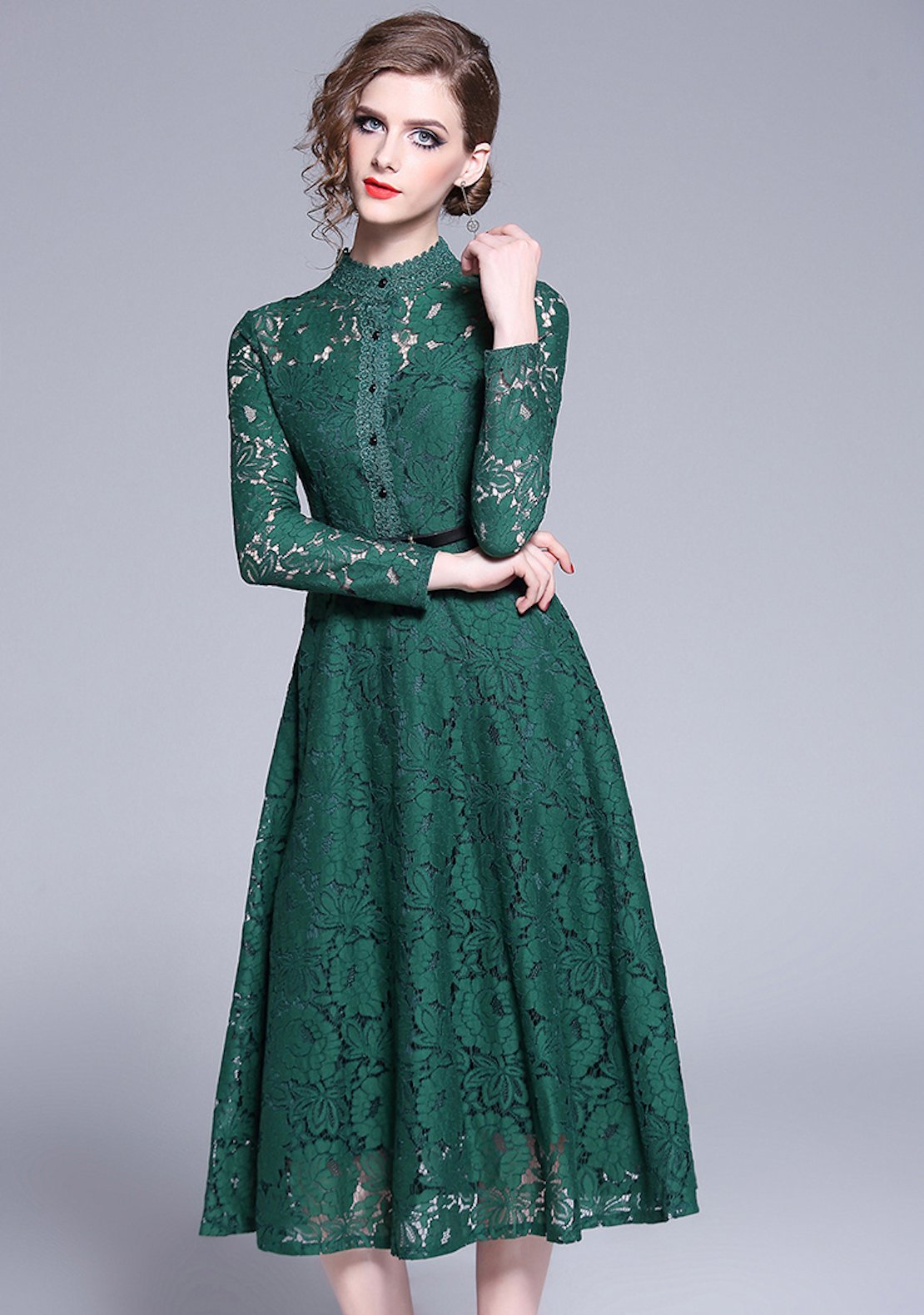 花柄 総レース シースルー フレア ベルト付き ワンピース ドレス エレガント パーティー お呼ばれ 膝丈 ミモレ丈 大人女子 ハイネック