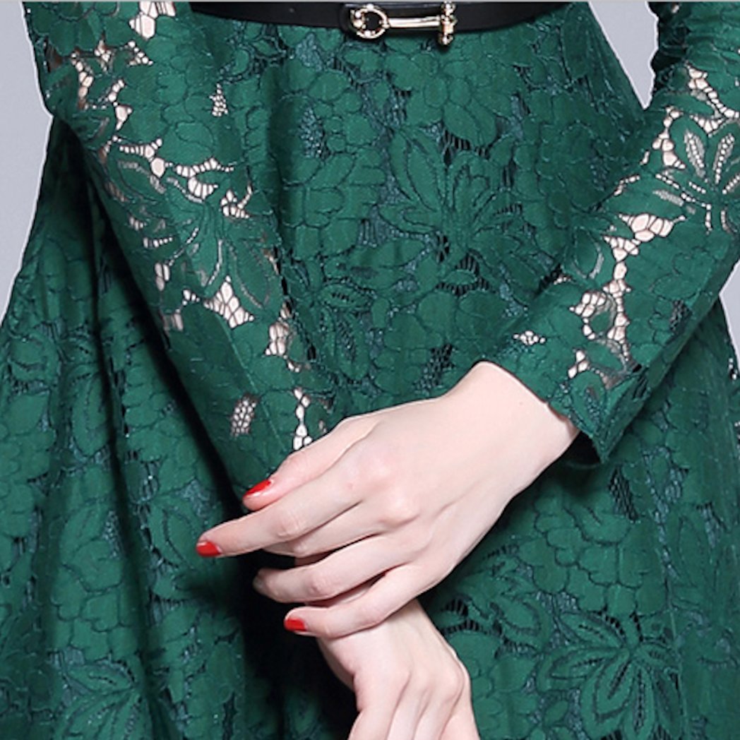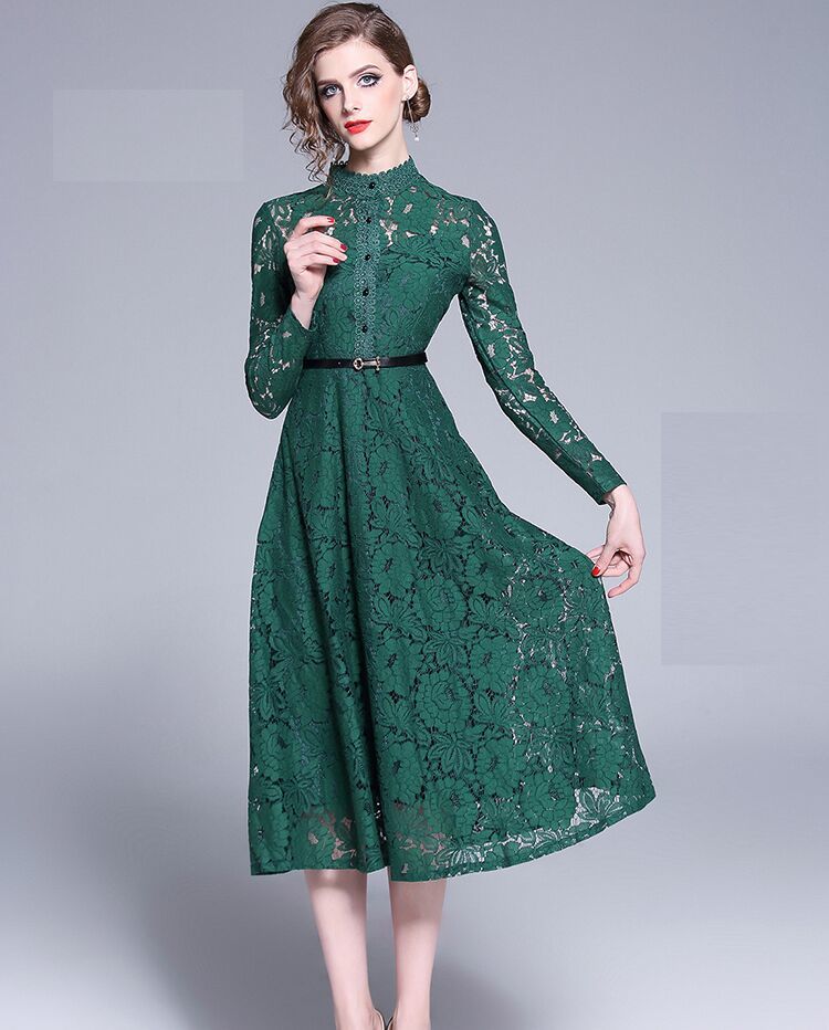 上品なレース刺繍が程よい大人透け感を演出してくれるベルト付きワンピースドレス。