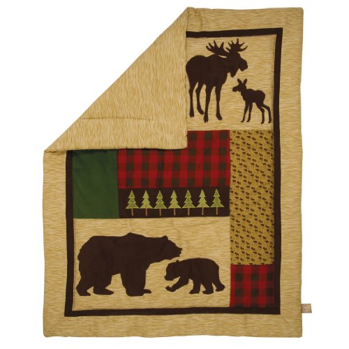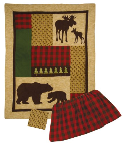 -. Feature : 3 Piece Crib Bedding Set Includes: Quilt, Fitted Crib Sheet, Crib Skirt / Quilt: 35" x 45"; Sheet: Fits a 52" x 28" crib mattress with 10" pockets; Skirt: 13" drop / Machine Wash / Quilt: Front: 100% cotton exclusive of decoration; 100% polyester applique back: 100% cotton; skirt/sheet: 100% cotton / Coordinating Northwoods crib bumpers and room accessories are sold separately