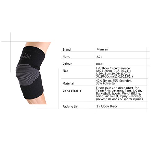 Features: 1. The padded Tennis Elbow brace provides adjustable support and has been designed to help provide relief from pain and soreness in the forearm and elbow 2. The brace features a lightweight but durable design and is very comfortable to wear all-day 3. The strap provides relief at the muscle insertion which allows concentrated pressure that helps relieve elbow pain and discomfort as well as a custom fit 4. Application: Arthritis, Epicondylitis (Tennis Elbow), Epicondyle (Golfers Elbow), Hyperextension Injury, Protection when playing sport or working in the gym Specifications: Brand: Mumian Model: A21 Color: Black Material: 42% Nylon, 25% Spandex, 33% Polyester Size: M(23-26cm),L(26-29cm),XL(29-32cm) Quantity: 1 Pc Note: Please allow 1-3mm error due to manual measurement. pls make sure you do not mind before you bid Due to the difference between different monitors, the picture may not reflect the actual color of the item. Thank you! Package includes: 1 Pc x Elbow Sleeve 0