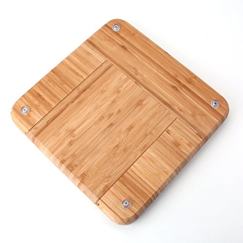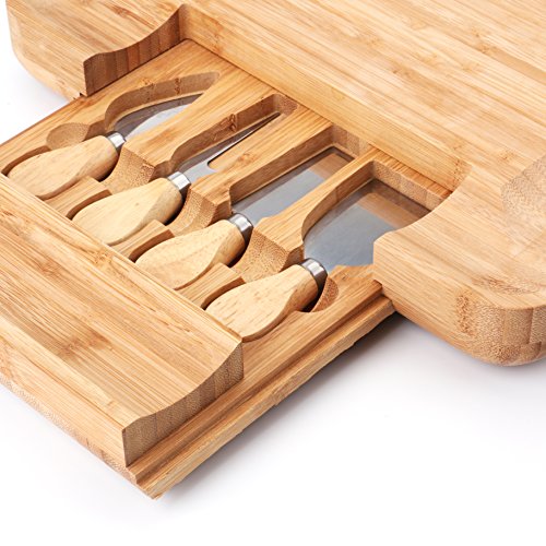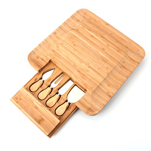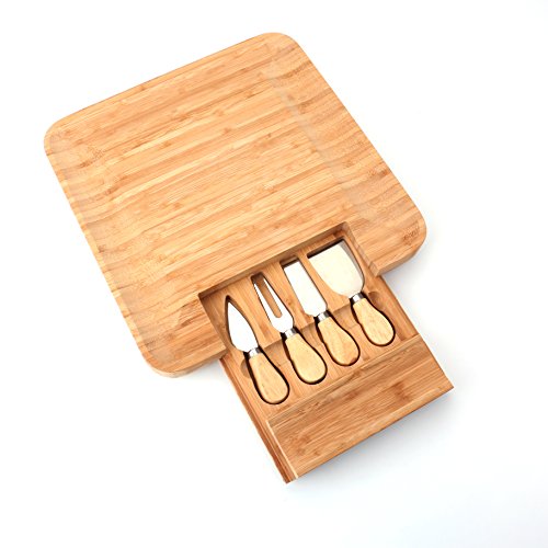 Tosnail Square Bamboo Cheese Board with Slide Out Tray & 4 Piece Knife Set