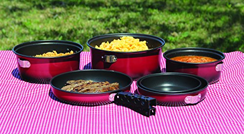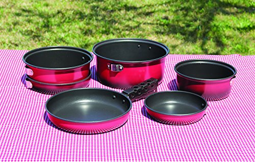 -. Feature : Made of durable, lightweight aluminum / Easy cooking/easy cleaning non-stick interior / Kit contains: 1 qt. pot, 6-1/2 fry pan/lid, 1-1/2 qt. pot, 7-1/2 fry pan/ lid, / Two-tone heat treated exterior finish / Also 2-1/2 qt. pot, 8-3/4 fry pan/lid, pot/ pan gripper, and mesh carry/storage bag