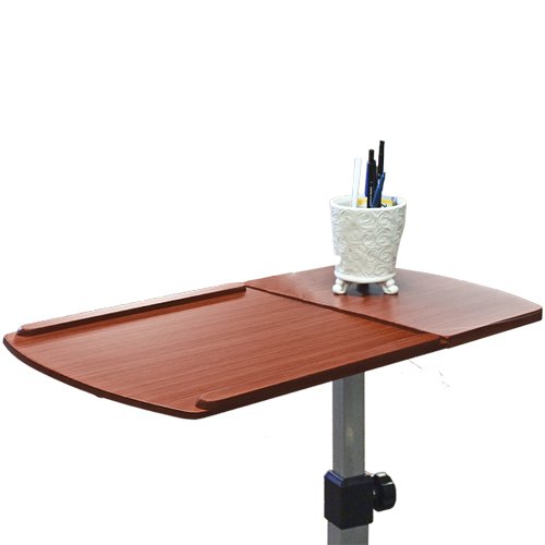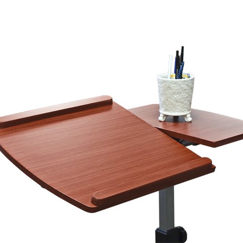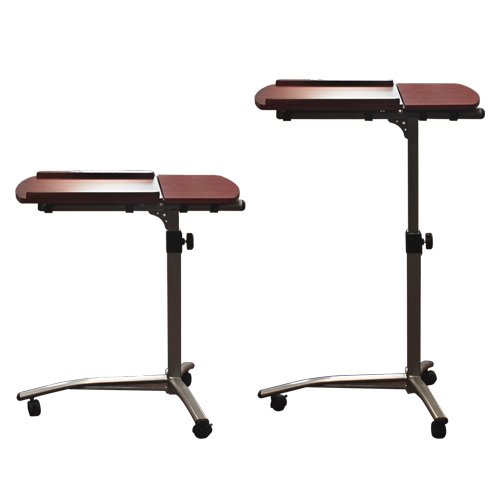 Splitting tabletops 2 adjustable shelves Beautiful solid maple walnut color tabletops Smooth tabletops with round corners for easy cleaning Slide stopper on both ends convenient for both left hand and right hand users Both tabletops are angle and height adjustable to your liking T-Base with swivel casters for stability and brakes to stop the moving