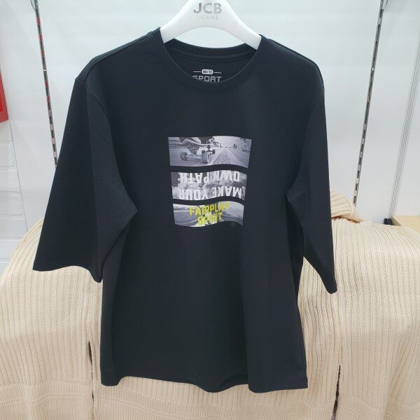 2019년 봄 상품입니다. 힘 있는 소재의 5부 기본 티셔츠로 앞면에 프린팅이 있습니다.벙벙한 핏으로심플하면서도 멋스러운 아이템입니다.
