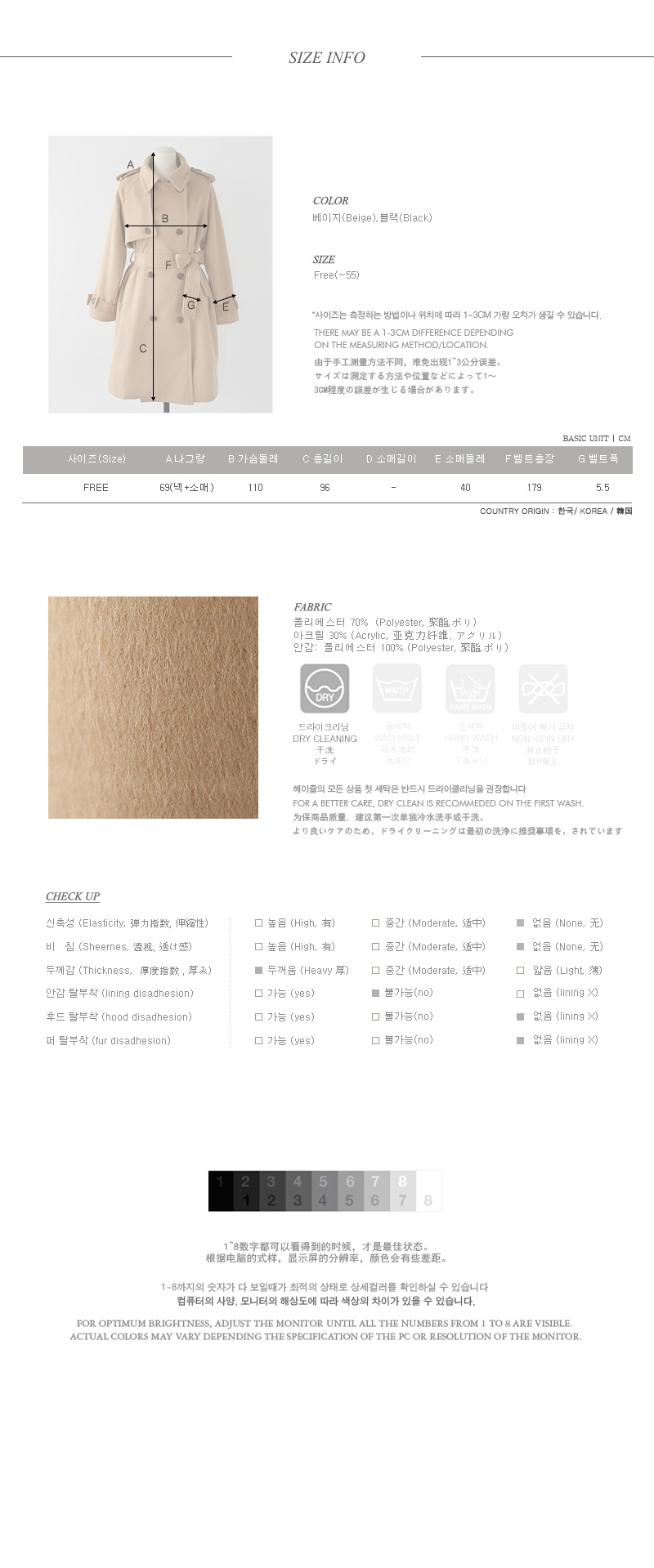 클래식한 무드를 연출해 주는 모직소재의 벨티드코트에요! 고급진 모직소재의 코트로 겨울시즌에도 부담없이 연출되구요, 트렌치코트 스타일로 다양한 룩에 클래식한 무드를 더해주는 코트에요~ 군더더기없는 디자인으로 다양한 룩에 간편하게 코디되구요, 유행없는 디자인으로 오랫동안 소장하기 좋은 롱런 아이템이에요! 컬러감까지 베이직해 한층 더 데일리한 룩을 완성하는 코트에요^^