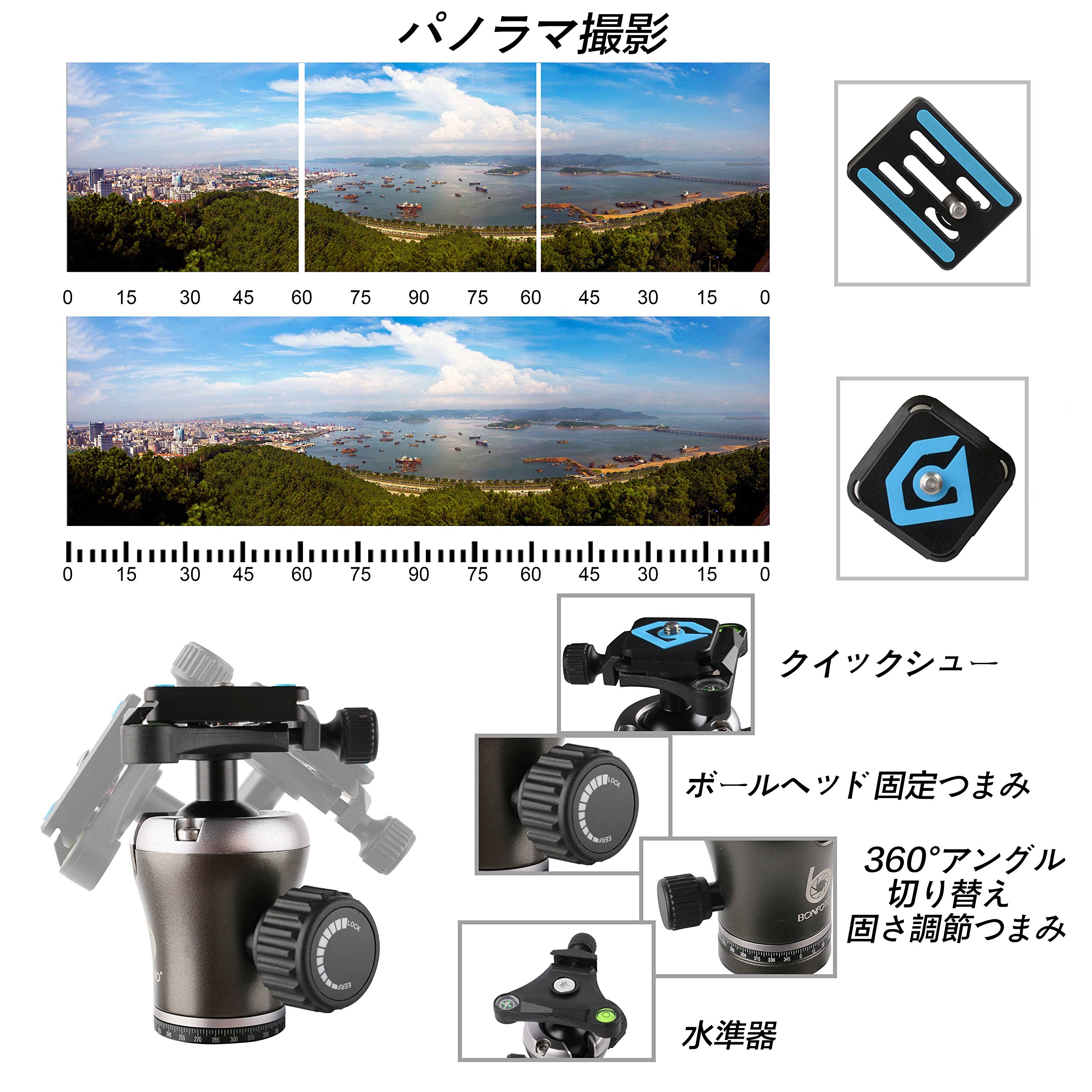 With a rotary knob and angular rotation scale on the bottom of the pan head slowly turn the pan head horizontally and take 360 angle photographs to help delicate panoramic composition.