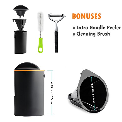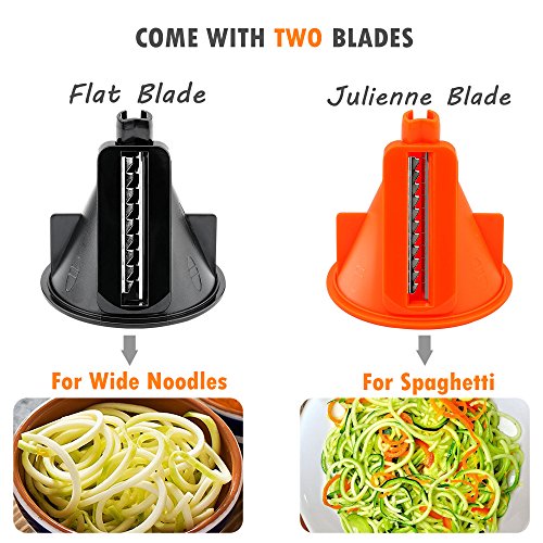 【TWO BLADES: JULIENNE BLADE FOR SPAGHETTI / FLAT BLADE FOR WIDE NOODLES】The ultra sharp blades are made of 18/8 stainless steel. Premium material keeps the blades sharp for longer.【BONUSES – HANDLE PEELER, CLEANING BRUSH】We offer 12 month warranty and 100% satisfaction guarantee. We mean it. Contact us without any hesitation if you have any issues or don’t know how to use it. :-)