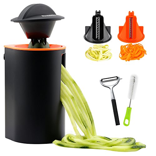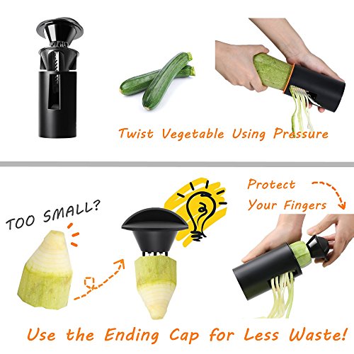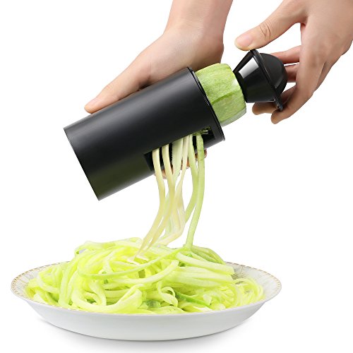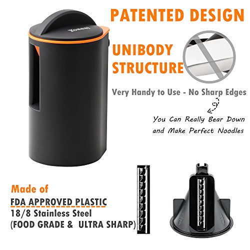 【FDA CERTIFIED】Made of BPA-Free ABS Plastic and food grade stainless steel. It’s safe to use for food. Contains NO harmful chemicals. Works great with zucchini, carrots, squash and cucumbers for zucchini noodles/ zoodle, veggie pasta or spiralized salads.
